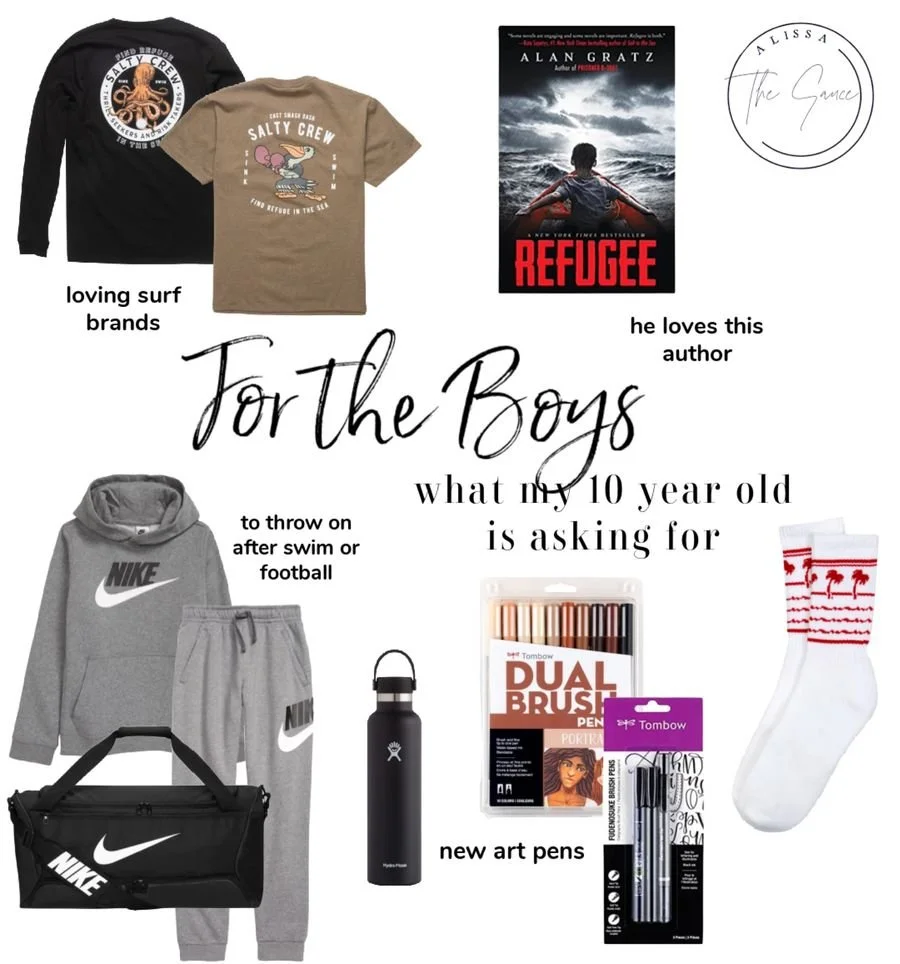 I feel like boys can be tricky, especially when they’re approaching the tween stage. I went a little more in depth for Hudson since he was pickier this year and I thought it would help for a son, nephew or little brother. He requested specific brands this year like surf brands and Nike for flag football. Also he wants the ON shoes in black and a black water bottle